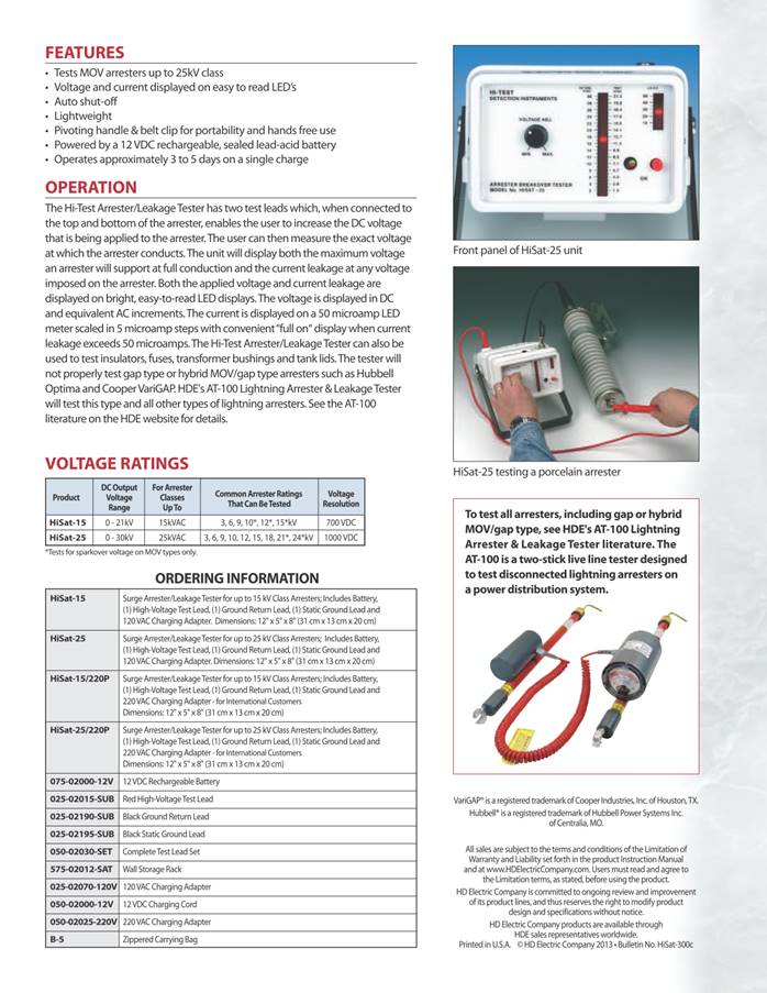 The Hi-Test® HiSat MOV Surge Arrester and Leakage Testers allow for the non-destructive testing of de-energized surge arresters for non-visible internal breakdown. These self-contained units are lightweight and portable for both shop and field use. The HiSat applies voltage across the arrester and indicates the breakover/conduction point of the arrester. It will determine if an arrester is conducting at lower voltages than specified or not conducting at all. Because of new arrester technology, the testers will not properly test gap or hybrid MOV/GAP type arresters such as Hubbell® Optima or Cooper VariGAP®.